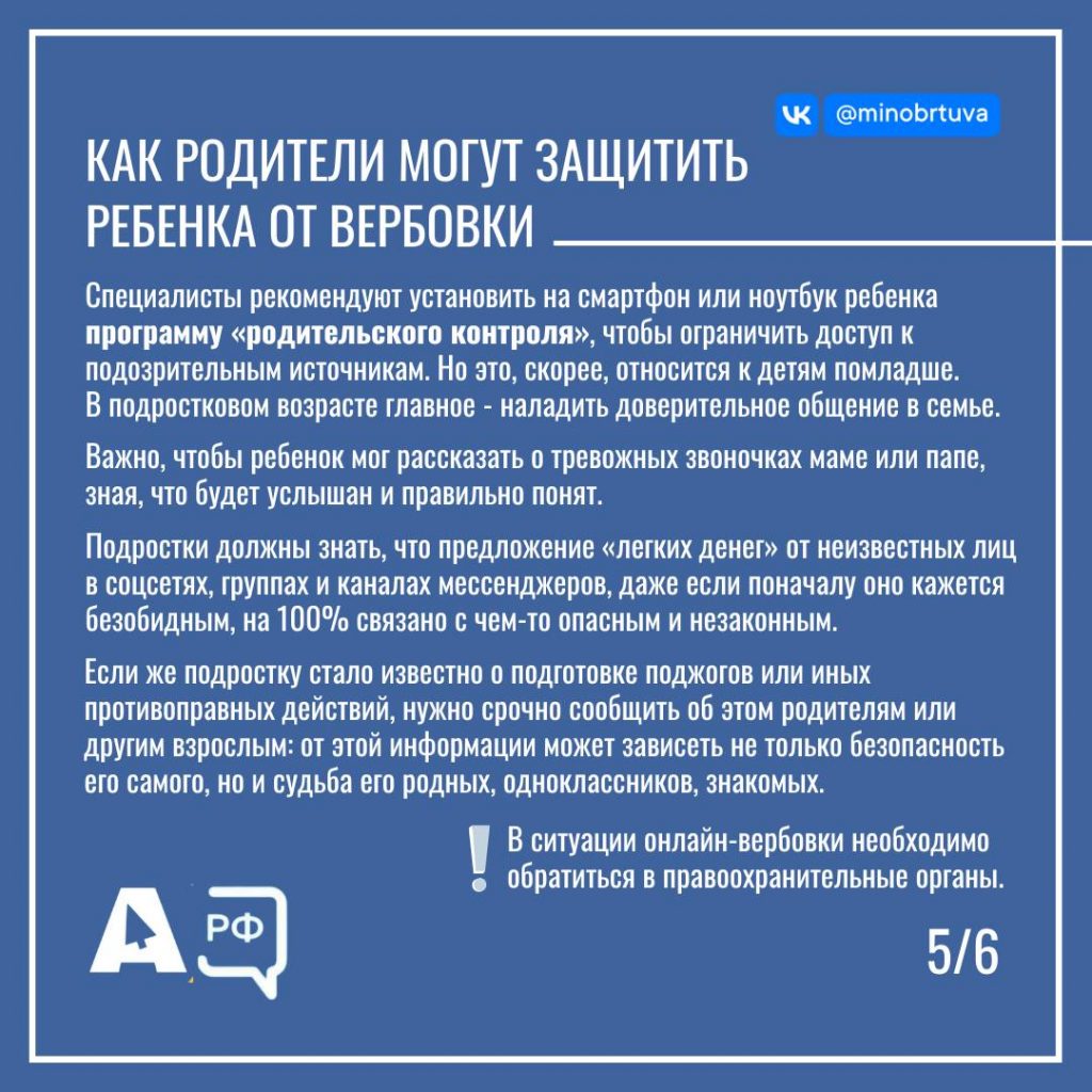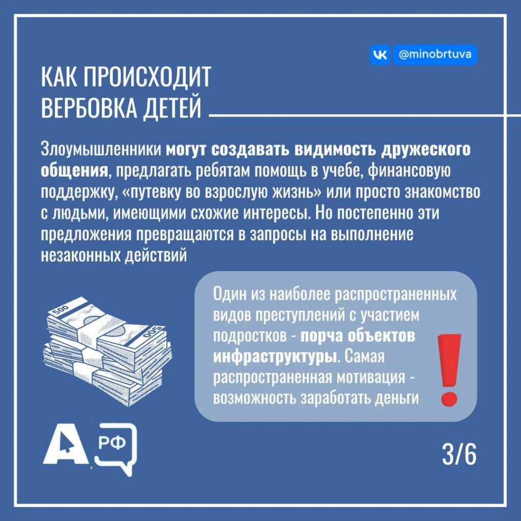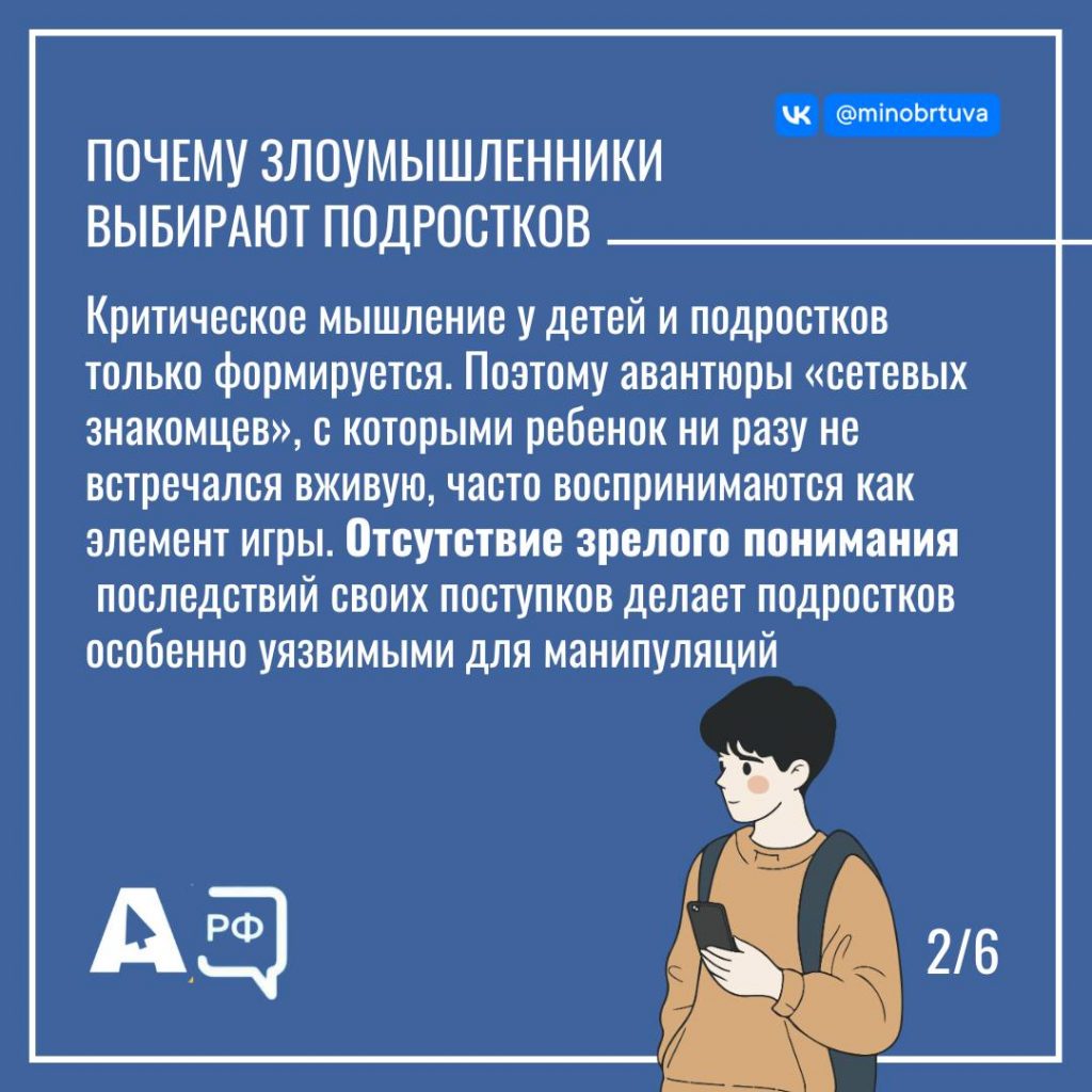 Дети и подростки — самая уязвимая категория пользователей соцсетей: их способность быстро осваивать компьютерные технологии не всегда означает соблюдение правил информационной безопасности: многие становятся жертвами манипуляций, не осознавая последствий своих поступков. Важно знать, что коммуникацию злоумышленники налаживают через социальные сети и мессенджеры. Преступники манипуляциями и шантажом втягивают несовершеннолетних в преступные схемы, пользуясь тем, что подростки проводят много времени в Интернете и не соблюдают правила безопасности. Отсутствие зрелого понимания последствий своих поступков делает подростков особенно уязвимыми для манипуляций. Большинство подростков сталкиваются с какими-либо видами цифровых угроз. При этом каждый пятый подросток не обращается за поддержкой к родителям при возникновении угроз психологического характера. Уважаемые родители! Важно, чтобы ваш ребенок мог рассказать о тревожных звоночках маме или папе, зная, что будет услышан и правильно понят. В подростковом возрасте главное — наладить доверительное общение в семье. Будьте внимательны к своим детям и будьте бдительны. Мы должны сообща оградить подрастающее поколение от интернет-угроз и киберпреступников. Подробнее можно ознакомиться в статье