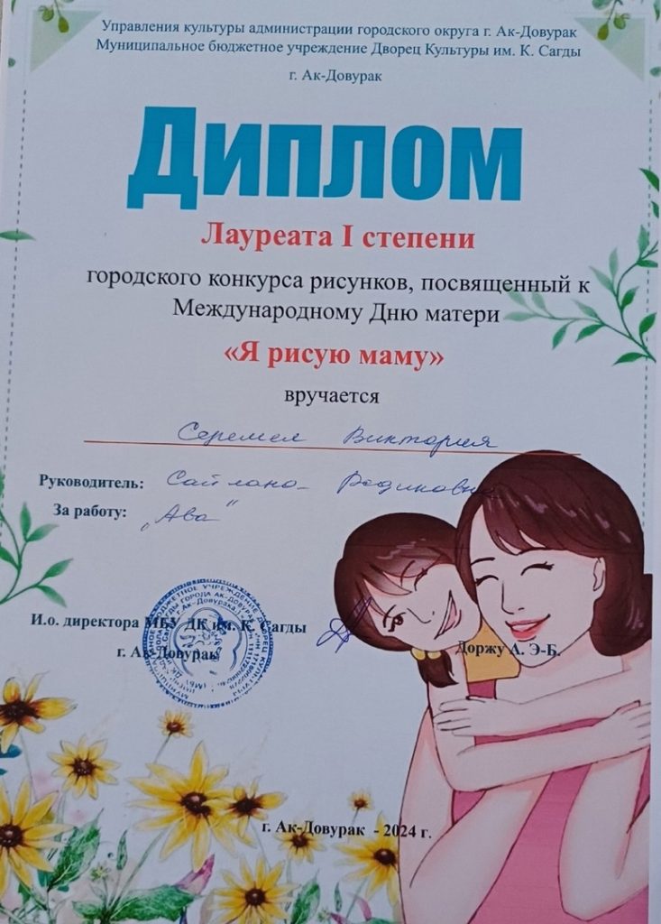 Обучающаяся нашего Центра Серемел Виктория приняла участие в городском очном художественном конкурсе рисунков, посвященный ко Дню матери «Я рисую маму» и заняла 1 место! Поздравляем!!!