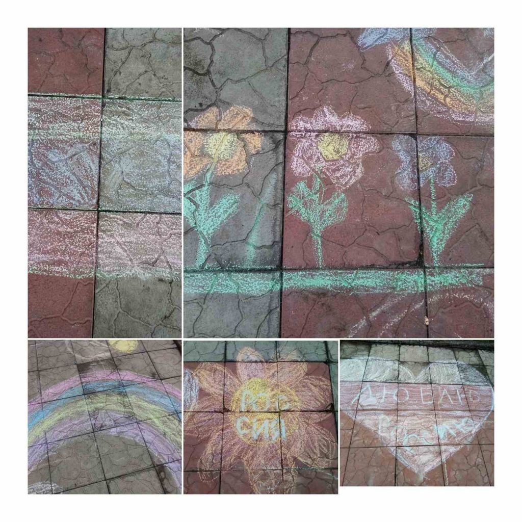Девчонки которые любят рисовать рисовали на асфальте сердце в цвета флага, радугу, разноцветные цветы, флаг России и звезду.