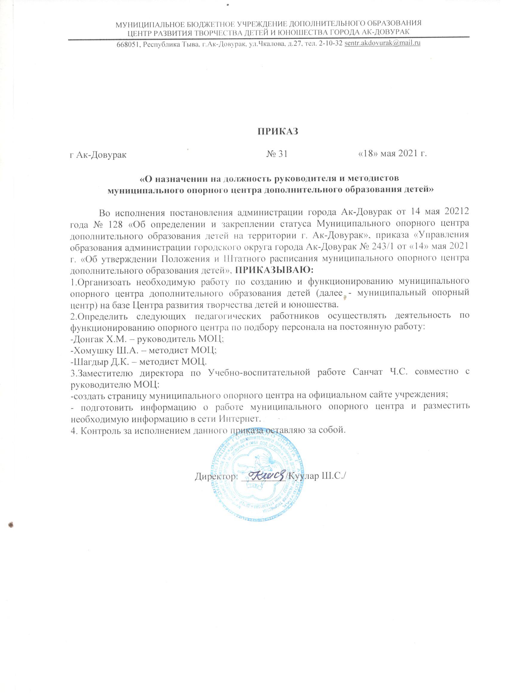 Нормативные документы Региональные 27.04.2021_1711_Tamchaj-S.M._Tombulak-A.VСкачать 26.04.2021_1664_Распоряжение-Правительства-РТСкачать Муниципальные Распоряжение-адм-цииСкачать Постановление-и-Положение-Администрации-городаСкачать Приказ-УОСкачать Документация МОЦ приказ-моц-001-Приказ-ЦРТДЮ Должностная-на-руководителя-МОЦСкачать 5-Должностная-инстркуция-Методист-МОЦ-1-1-1Скачать