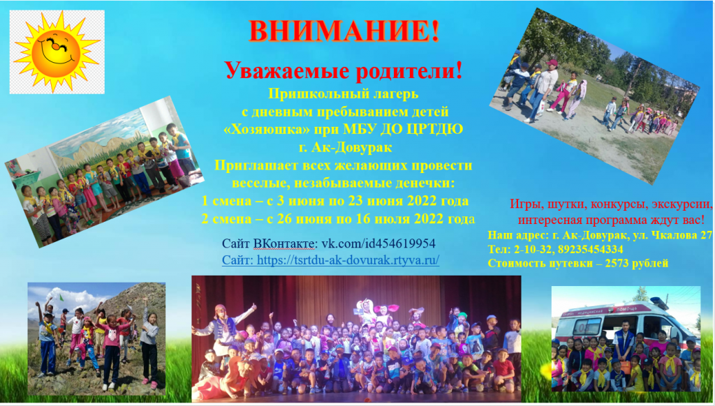 Первый день — 03.06.2022 пришкольного лагеря «Хозяюшка» на базе МБУДО ЦРТДЮ г. Ак- Довурак. Воспитателями были проведены инструктажи по технике безопасности, правила поведения в пришкольном лагере, дети познакомились внутренним распорядком. Проведены утренняя зарядка, минутка здоровья «Как поднять настроение» и игра «Запомни имя друга», а также дети подготовили подделки для оформления уголков отряда. Охват – 16. Мбудо Цртдю (vk.com)
