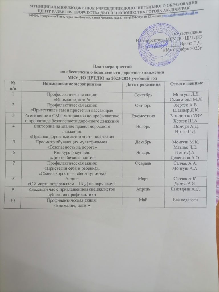 22 сентября 2023 года педагогами и обучающимися МБУ ДО ЦРТДЮ была проведена профилактическая акция по безопасности дорожного движения: «Внимание, дети!», были розданы буклеты. https://vk.com/public217227927?w=wall-217227927_405