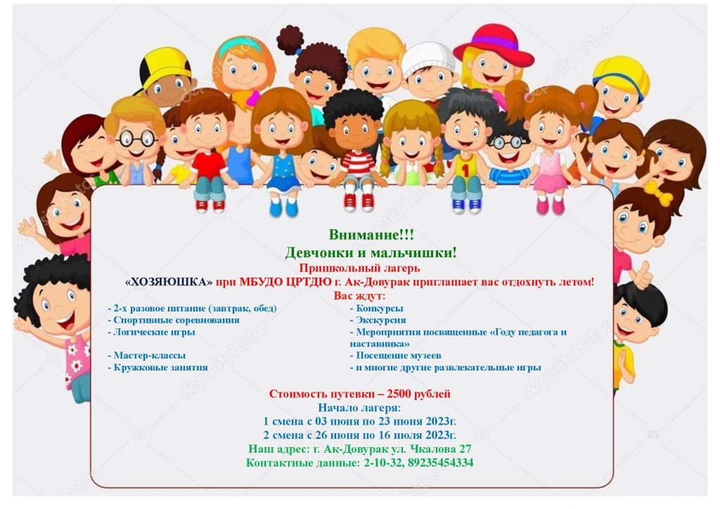 2 сезон — 26 июня 2023 г. первый день лагеря «Хозяюшка» на базе МБУДО ЦРТДЮ г. Ак- Довурак. Были проведены: утренняя зарядка, инструктажи по безопасности, ознакомления с правилами поведения в пришкольном лагере и его внутренним распорядком, игры на знакомство «Снежный ком» и «Мяч по кругу», экскурсия по лагерю, а также оформление отрядных уголков « Вместе весело живется». Дети распределены по отрядам «Мы вам рады».