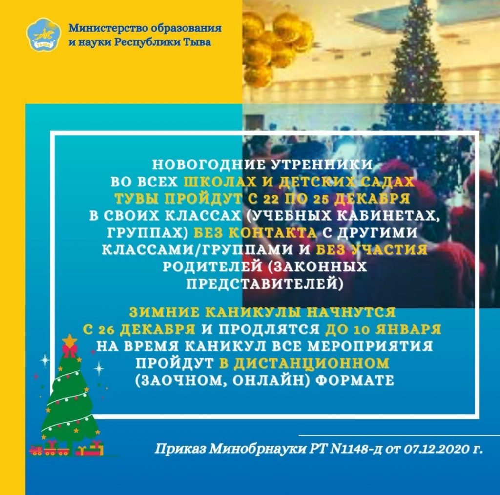 Новогодние утренники во всех образовательных организациях Тувы пройдут с 22 по 25 декабря в своих классах (учебных кабинетах, группах) без контакта с другими классами и группами и без участия родителей (законных представителей).Классные руководители и воспитатели должны провести утренники на высоком организованном уровне, главные герои Дед мороз и Снегурочка посещают по графику классы, группы.Зимние каникулы школьников начнутся с 26 декабря 2020 года и продлятся до 10 января 2021 года — на время каникул все мероприятия пройдут в дистанционном (заочном, онлайн) формате.Приказ Министерства образования и науки Республики Тыва «Об организованном завершении второй учебной четверти, проведении зимних каникул обучающихся 2020-2021 учебного года и об усилении мер безопасности в праздничные и каникулярные дни» от 7 декабря 2020 г. N1148-д.